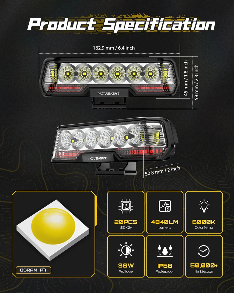 Enhance your driving safety with this 6” Dual-Color LED Reverse and Brake Light Bar. Designed with high-brightness flood beam technology, it provides clear visibility in low-light conditions. Available in Red/White and Yellow/White modes, this integrated light bar offers reliable performance, easy installation, and long-lasting durability for everyday and off-road use.