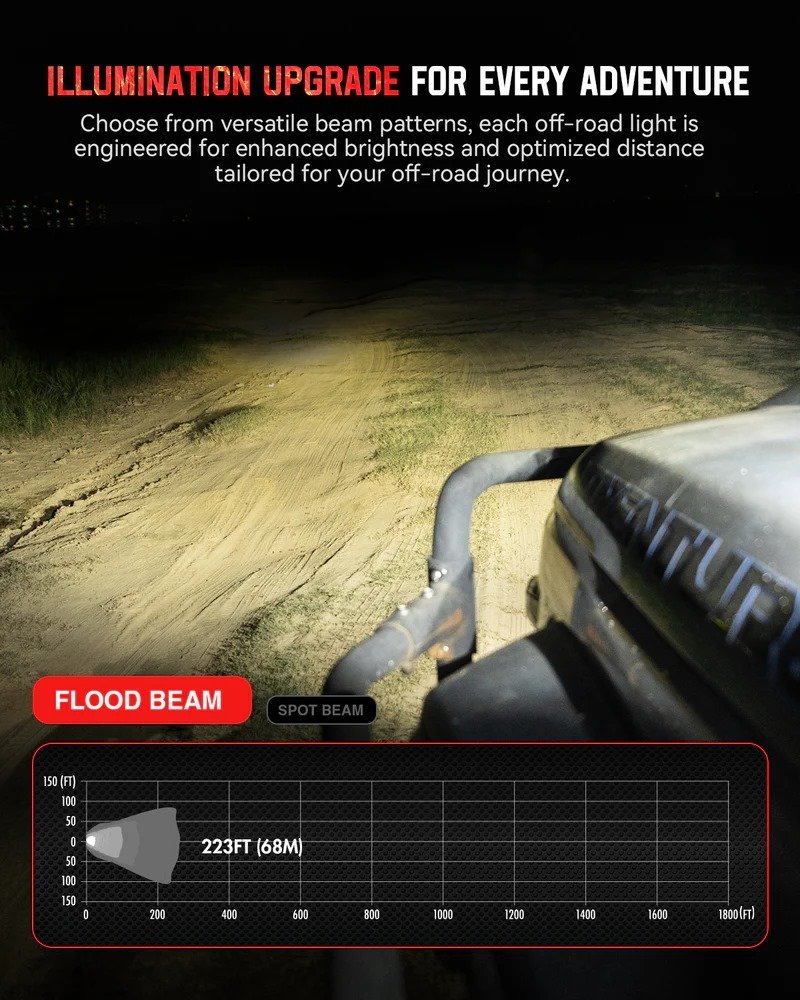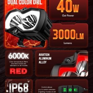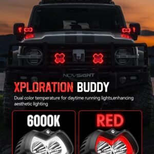 Novsight HALO SE Series 4.5-Inch LED Pod Lights feature red and white dual-color DRL and a wide flood beam pattern for excellent side and trail visibility. Designed with a durable waterproof housing and high-brightness LEDs, these auxiliary lights are ideal for motorcycles, ATVs, and UTVs, providing enhanced safety, reliability, and a bold modern look for every ride.