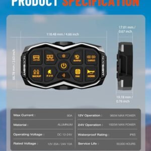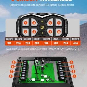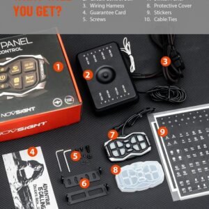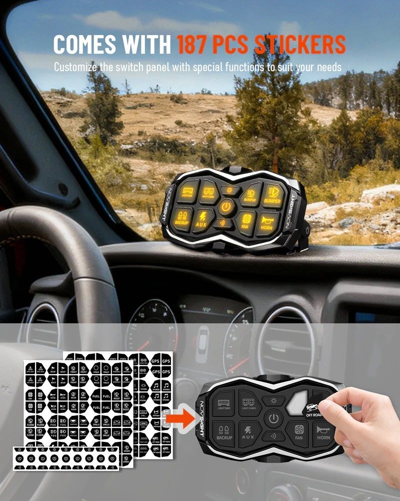 Novsight HALO Series 8-Gang Voice-Controlled Switch Panel (8 Circuits) lets you manage up to eight lights or accessories with voice commands or manual buttons for hands-free convenience. It features an aluminum alloy shell, RGB backlit switches, built-in circuit protection, and supports DC 12–24 V systems up to 960 W, making it perfect for off-road vehicles, trucks, SUVs, ATVs, and UTVs looking to organize and control multiple electrical devices.